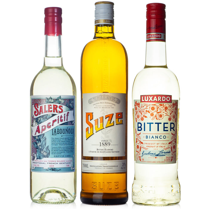 In this set we have our favorite ingredient to switch up - the bitter aperitif! Suze (the original), Luxardo Bitter Bianco and Salers - try each version to find your own personal favorite - or heck, why choose? We love all three!