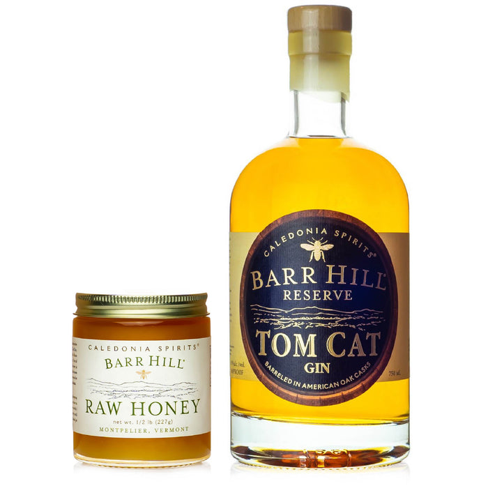 Kit includes: Barr Hill Reserve Tom Cat Barrel Aged Gin (750 ml), Caledonia Spirits Barr Hill Raw Honey (1/2 lb)
