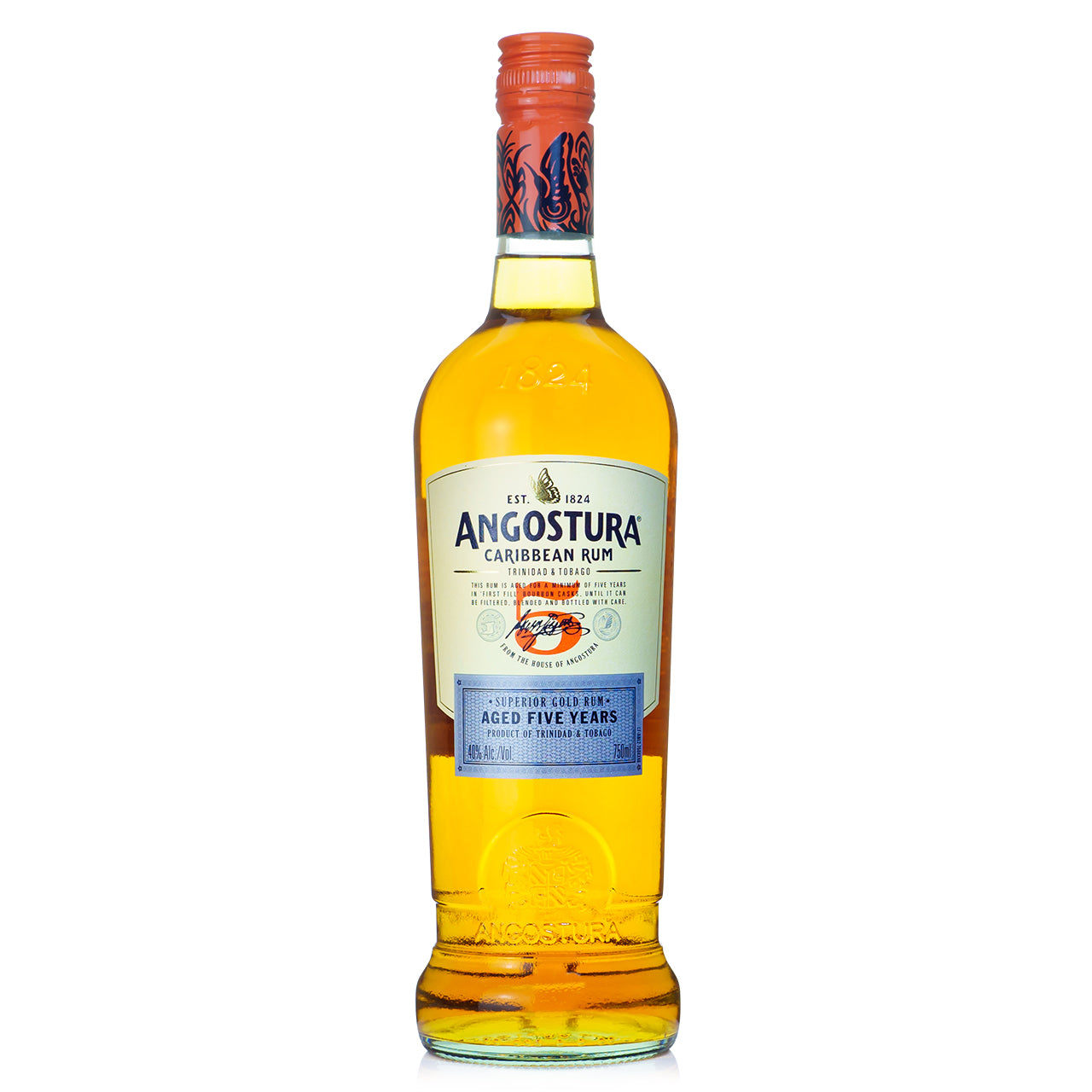 Angostura 5 Year is a mix of light and heavier rums from their 5 column still set up. The rums in this blend are aged between 5 and 8 years. The nose is soft and sweet with buttery vanilla and soft florals. The rum offers a nicely aged taste profile, no burn but it still delivers a bit of a kick with notes of vanilla ice cream and some slightly spicy dark chocolate. The finish is remarkably warm and mellow, and pairs well with stronger mixes, spices and herbs.