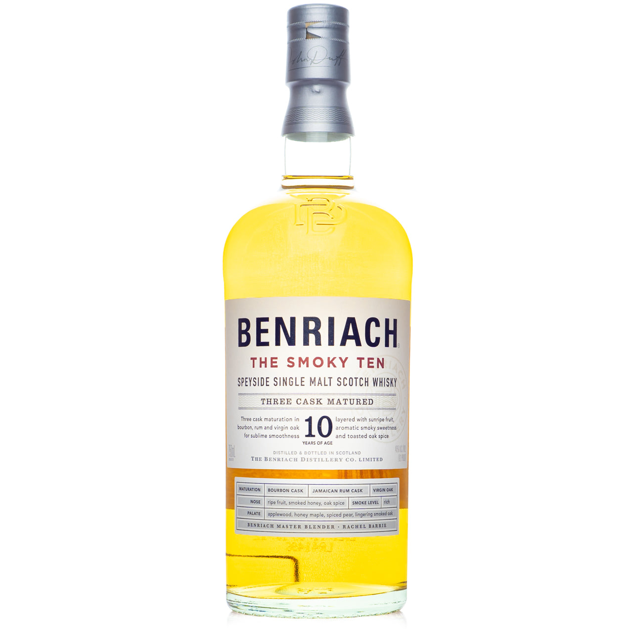 Sweet and inviting, Benriach's Smoky Ten is made from a blend of peated and unpeated malt aged for ten years and finished in a combination of virgin toasted oak, ex-bourbon, and ex-Jamaican rum casks before bottling at 92 proof. Nosing reveals scents of tropical fruit, sweet smoke, and light spice. The palate begins with sweet honey, tropical fruit, cinnamon, and sweet peat smoke before finishing on flavors of smoky grilled fruit and sweet oak.