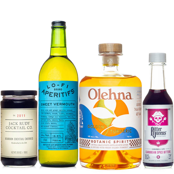 The "Tropical Manhattan" is an evergreen cocktail idea, injecting the perfect if austere classic some bright and sultry elements to freshen the aesthetic. Though it's been done beautifully before in classics like the El Presidente or the Palmetto, it's never been done quite like this. Instead of leaning on Rum as the Rye stand-in, Olehna's Turmeric and Ginger spirit brings a totally different spin on the idea, with fruity-spiced bitters tying it all together. Kit includes Olehna Golden Turmeric Spirit (750 ml), Lo-Fi Sweet Vermouth (750 ml), Bitter Queens Caribbean Bitters (5 oz), and Jack Rudy Cocktail Cherries (13.5 oz).