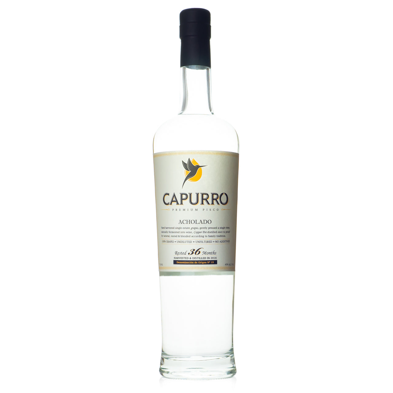 Hand harvested single estate grapes, gently pressed a single time, naturally fermented into wine, Copper Pot distilled once to proof by varietal, rested & blended according to family tradition. Capurro Pisco is made 100% of grapes, undiluted, unfiltered, and with no additives of any kind at any step of the production process.