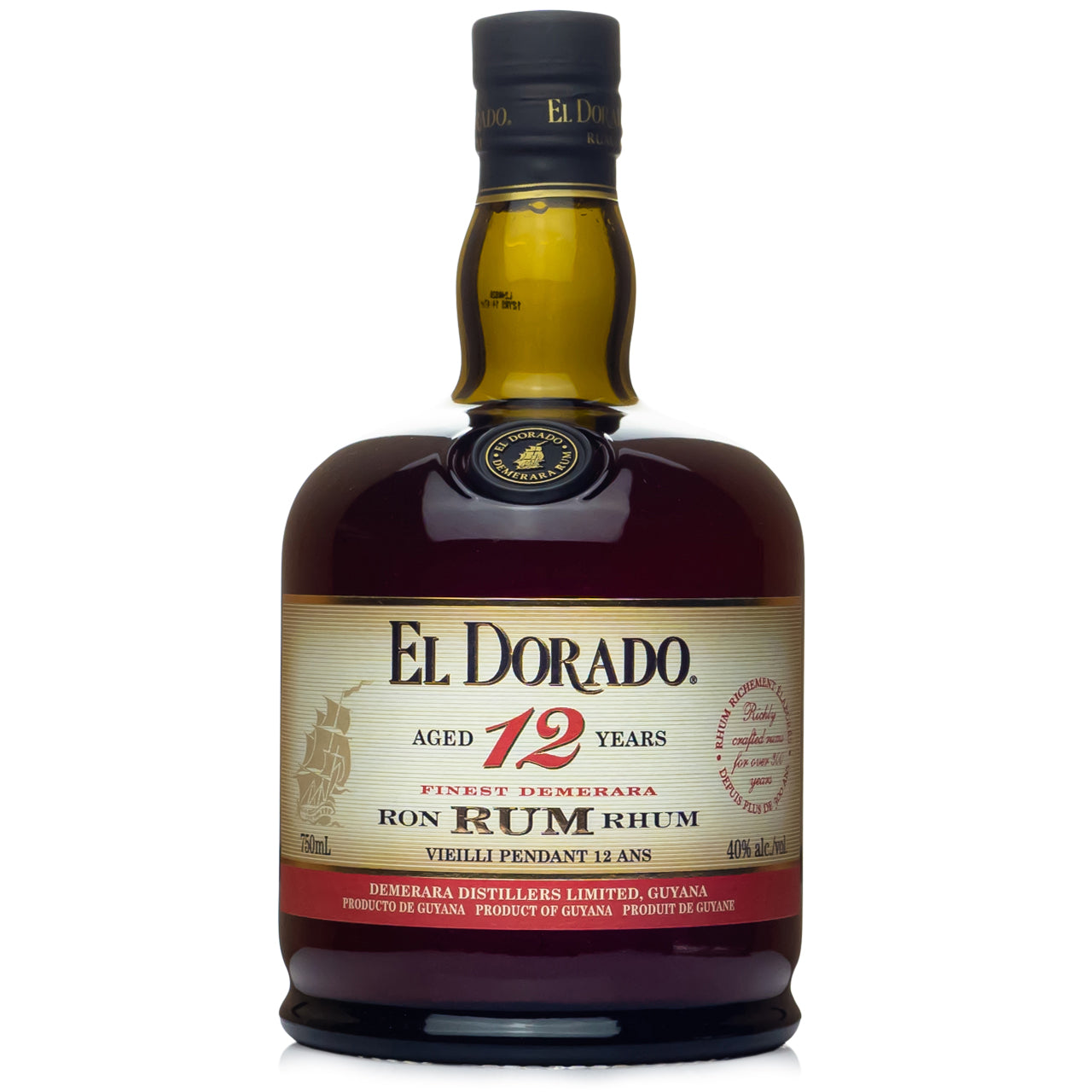 The El Dorado 12 Year Old possesses a rich fruity bouquet of explosive flavours, owing largely to the estery richness acquired from the EHP Wooden Coffey and Metal Coffey Stills. Lush tropical fruit and spice hit the nose, with hints of honey and dark sugar. Round, mellow, full bodied palate with rich flavours of fruit and spice. The finish is delightfully long, elegant and rich. Bottled at 40% abv.