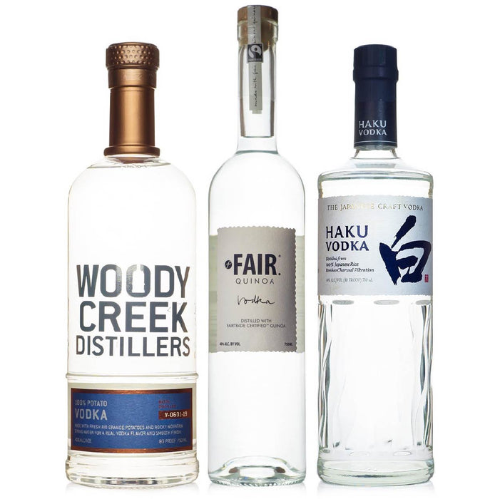 Flight includes: Woody Creek Potato Vodka (750 ml), Fair Quinoa Vodka (750 ml), and Haku Rice Vodka (750 ml)