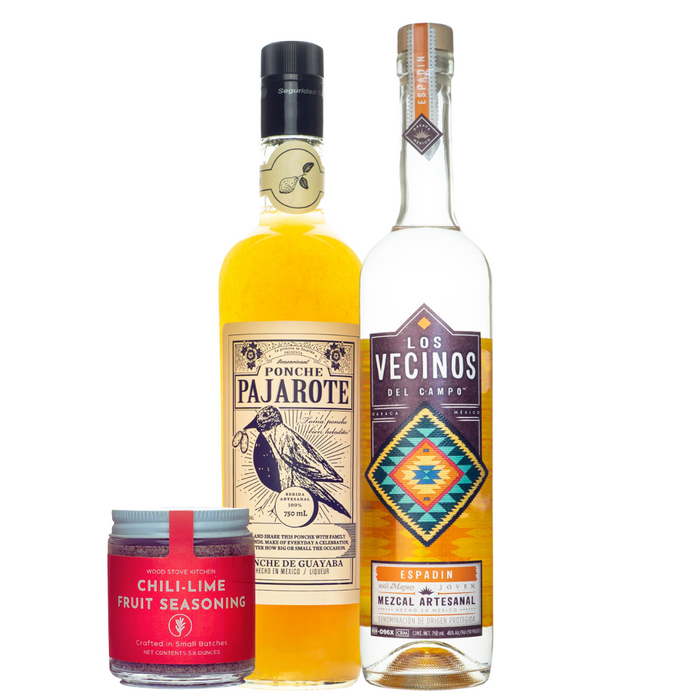 Kit Includes: Pajarote Ponche de Guyaba Guava Liqueur (750), Los Vecinos del Campo Espadin Mezcal (750 ml), Chili Lime Cocktail Salt