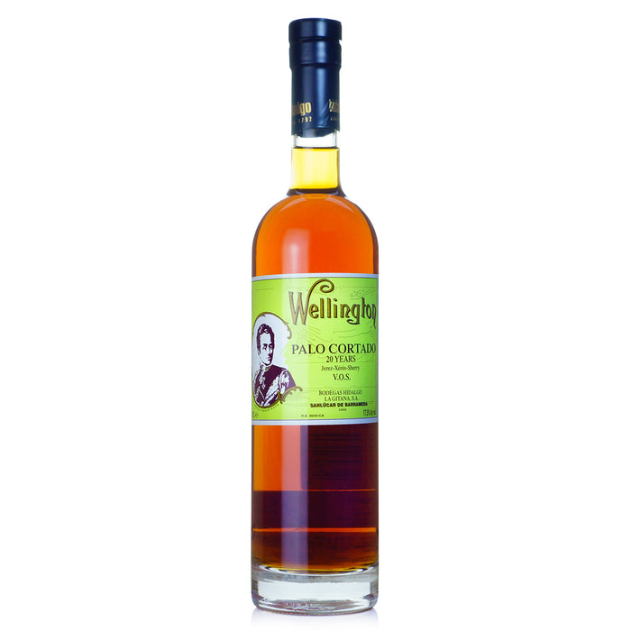 Palo Cortado is unusual, in that it first ages under a film of yeast ‘flor’ which protects it from oxygen, but then loses that flor to age oxidatively at the very end of the process. Thus, the freshness of Manzanilla and the complexity of dry Amontillado are combined. When aged over twenty years it is entitled to the designation VOS, (Very Old Sherry). This sherry was once sold to British troops under the name ‘Wellington’, and the 1st Duke of Wellington’s portrait is still used on the label today.