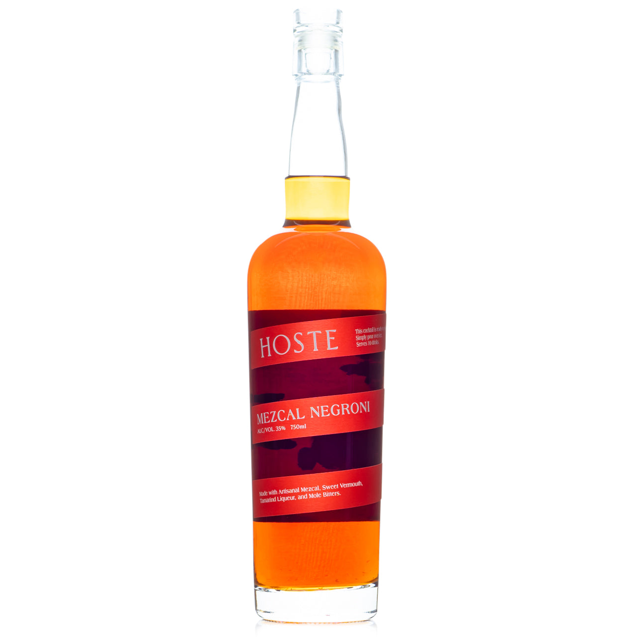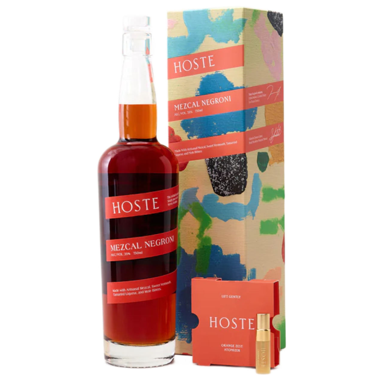 Hoste Cocktails' Mezcal Negroni is a ready-to-serve, bottled cocktail that's a tribute to the flavors of Oaxaca, Mexico. It's made with Paquera's Artisanal Ensamble Mezcal, sweet vermouth, tamarind liqueur, and bitters inspired by mole from Los Pacos Oaxaca, and includes an orange citrus zest atomizer. The drink is smoky and spicy, with roasted agave and tangy citrus flavors. *May contain peanuts