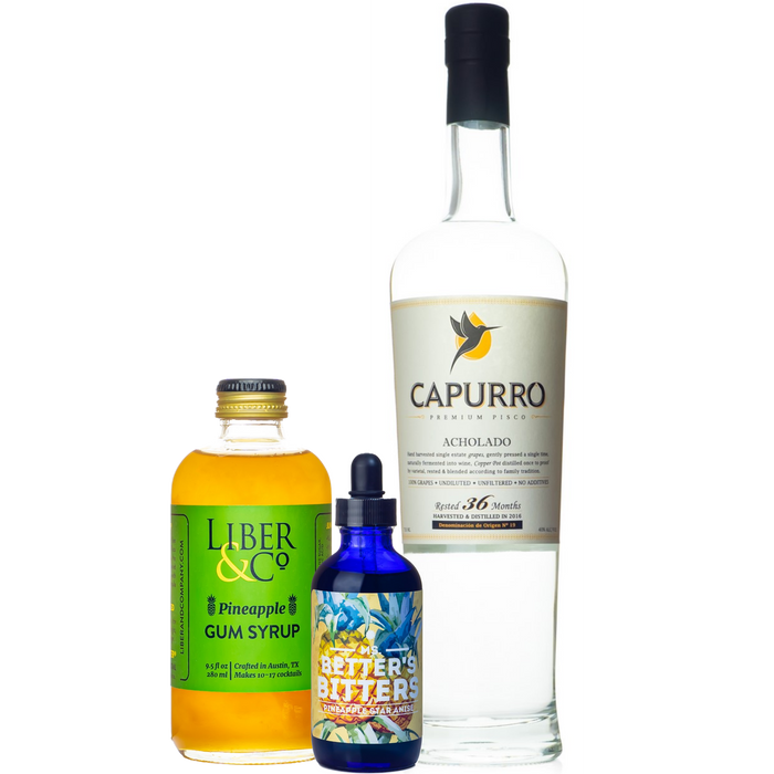 Kit Includes: Capurro Acholado Pisco (750 ml), Liber & Co Pineapple Gum Syrup (375ml), Ms. Better's Bitters Pineapple Star Anise Bitters (4oz)