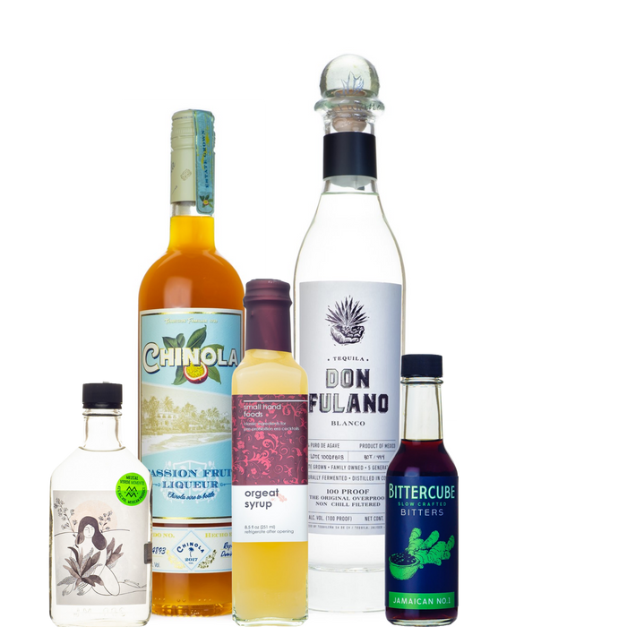 Kit includes: Don Fulano "Fuerte" Blanco 100 Proof Tequila 750 ml, Chinola Passion Fruit Liqueur 750 ml, Small Hand Orgeat Syrup 8.5 oz, Bittercube Jamaican No. 1 Bitters, Palomo Espadin Mezcal 375 ml