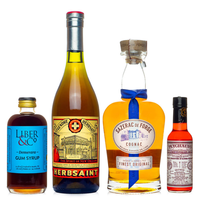 Kit Includes: Sazerac de Forge & Fils Finest Original Cognac (750 ml), Herbsaint Original Liqueur (750 ml), Peychauds Aromatic Cocktail Bitters (5 oz), Liber & Co Demerara Gum Syrup (375 ml)