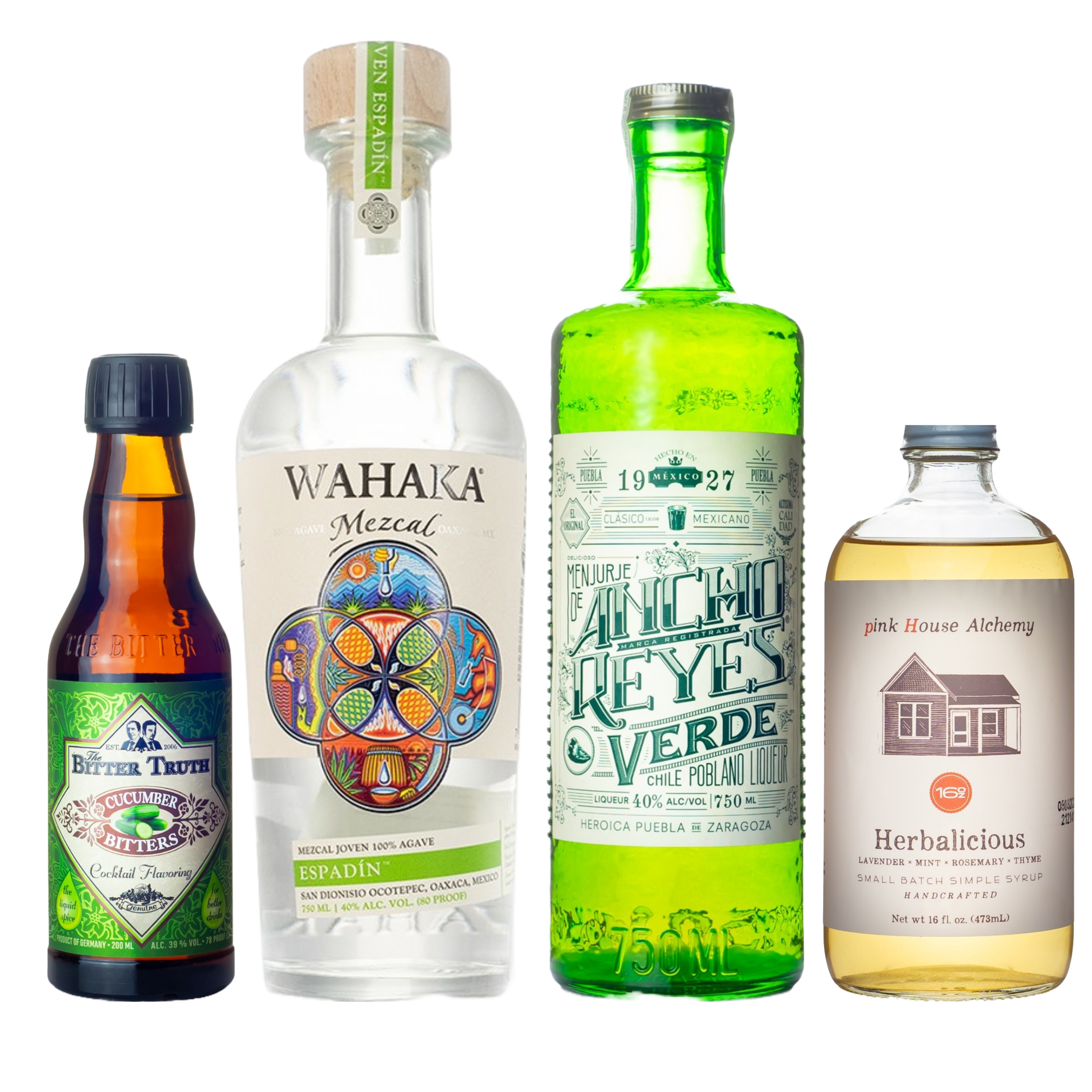 Kit includes: Wahakan Joven Mezcal 750 ml, Ancho Reyes Verde Liqueur 750 ml, Pink House Herbalicious 16 oz, Bitter Truth Cucumber Bitters 200 ml
