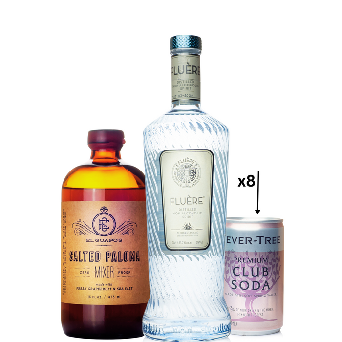 Kit includes: Fluere Smoked Agave Alcohol Free Spirit, El Guapo Salted Paloma Zero Proof Mixer, Fever Tree Club Soda 8-Pack